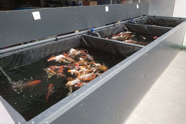 Fischrogen und Fischmilch der Kois werden dann in einem Laichbecken zusammengefügt. Nach drei Tagen schlüpfen die Jungfische aus den Eiern. Fünf Tage später setzen wir die Jungfische in einen unserer großzügig angelegten Zuchtteiche um. Einige Monate nach dem Schlüpfen erfolgt dann der Fang, wobei wir einen Teil der kleinen Fische für den Verkauf entnehmen. Die meisten Fische werden verkauft, sobald sie ein Jahr alt und etwa 10 bis 15 Zentimeter lang sind. Für den Verkauf an Koihalter, die erwachsene Fische bevorzugen, bleibt ein kleiner Teil der Fische länger bei uns.